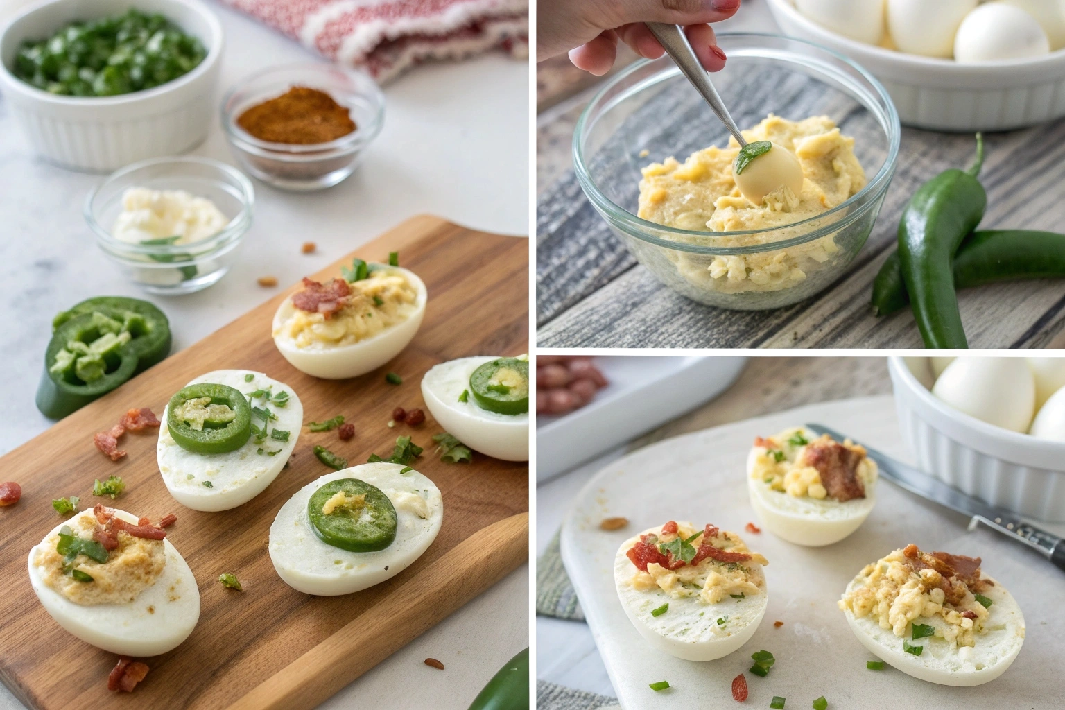Mash the yolks with cream cheese and mayonnaise until smooth. Stir in the chopped pickled jalapeños, cheddar cheese, green onion, salt, and pepper. Adjust the heat level by adding more or fewer jalapeños to taste.